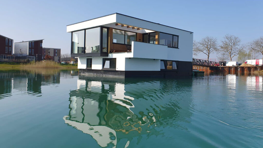 4 waterwoningen Zeewolde Vorige Volgende Nieuwbouw Levering en montage van de bovenbouw van het casco. De afbouw wordt door de aannemer/opdrachtgever zelf uitgevoerd.